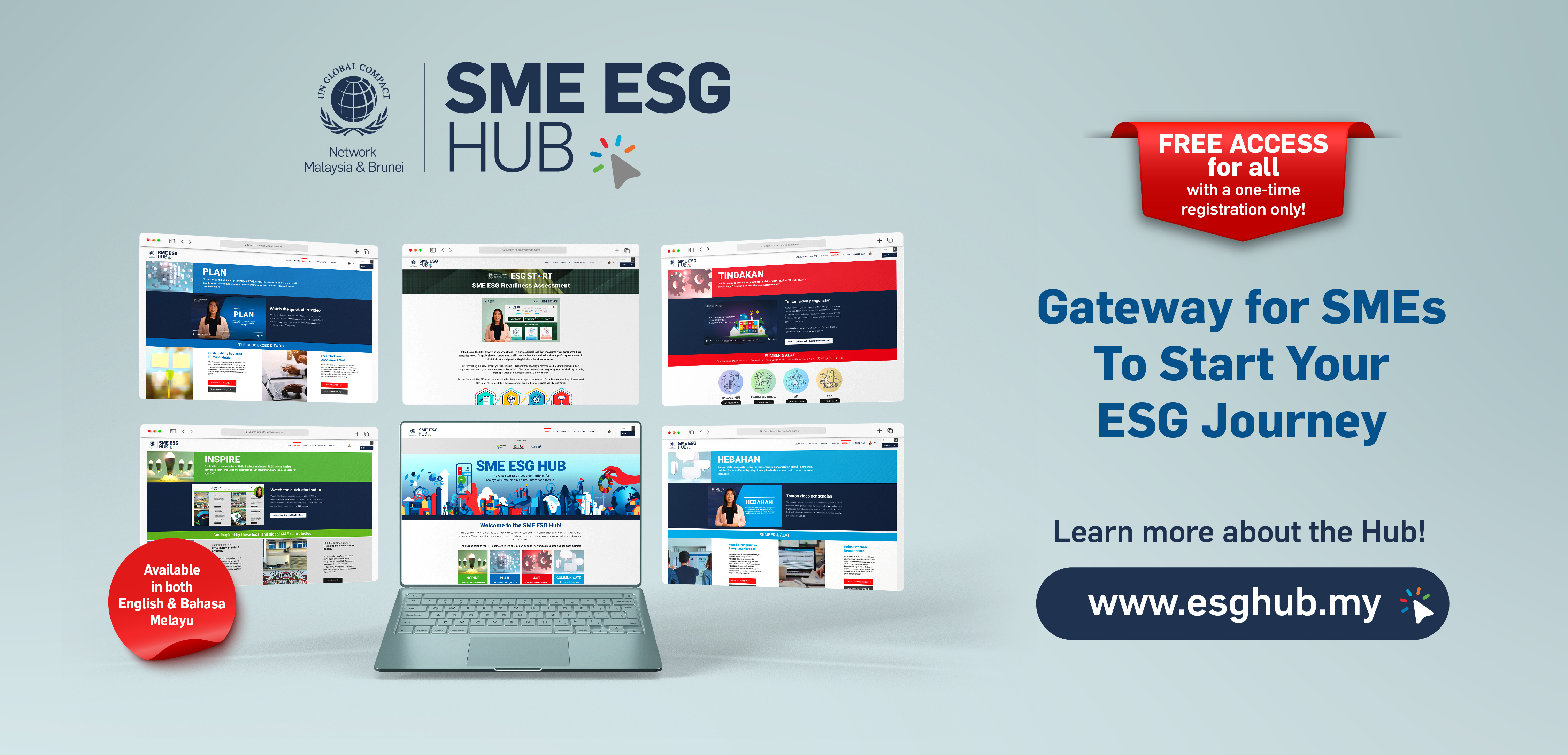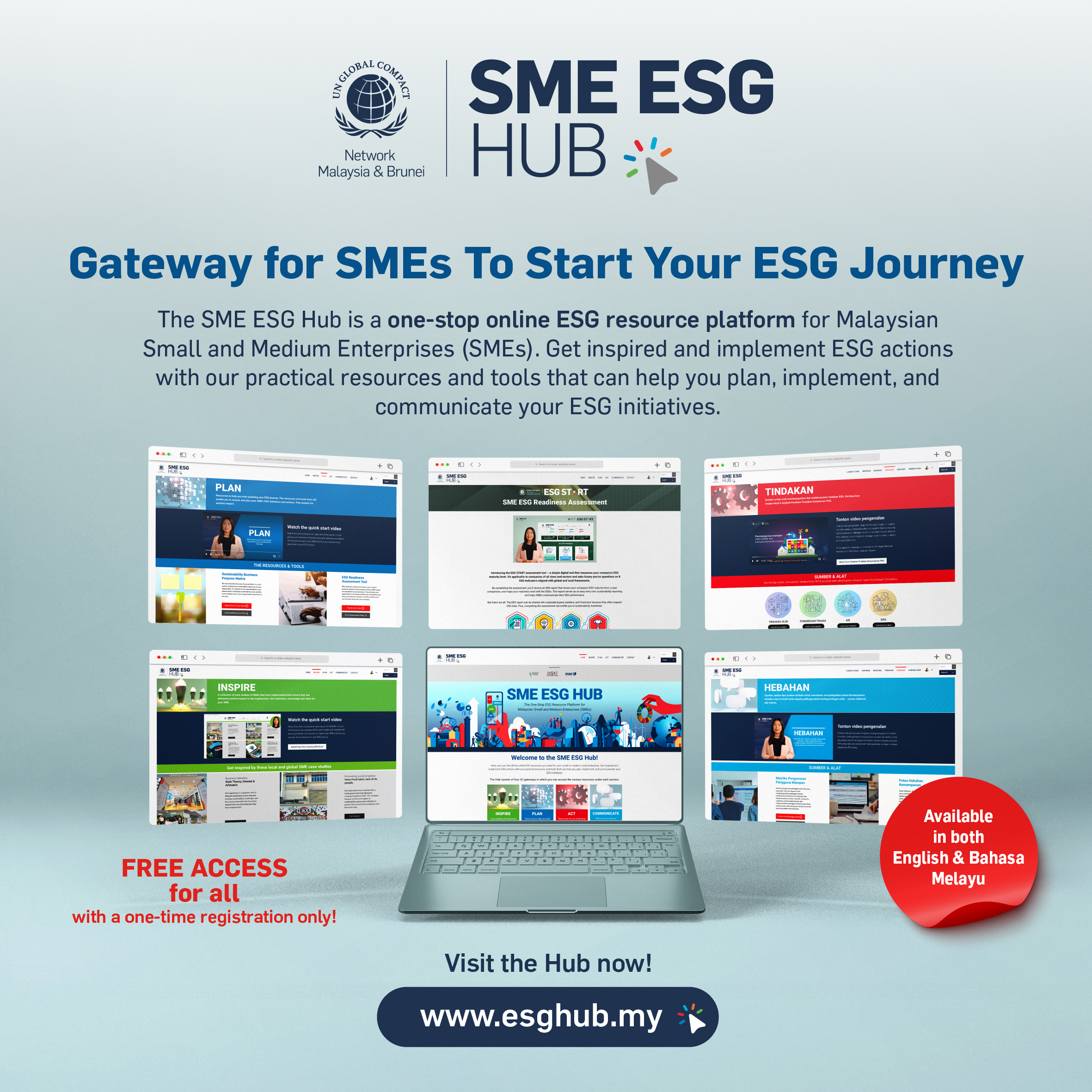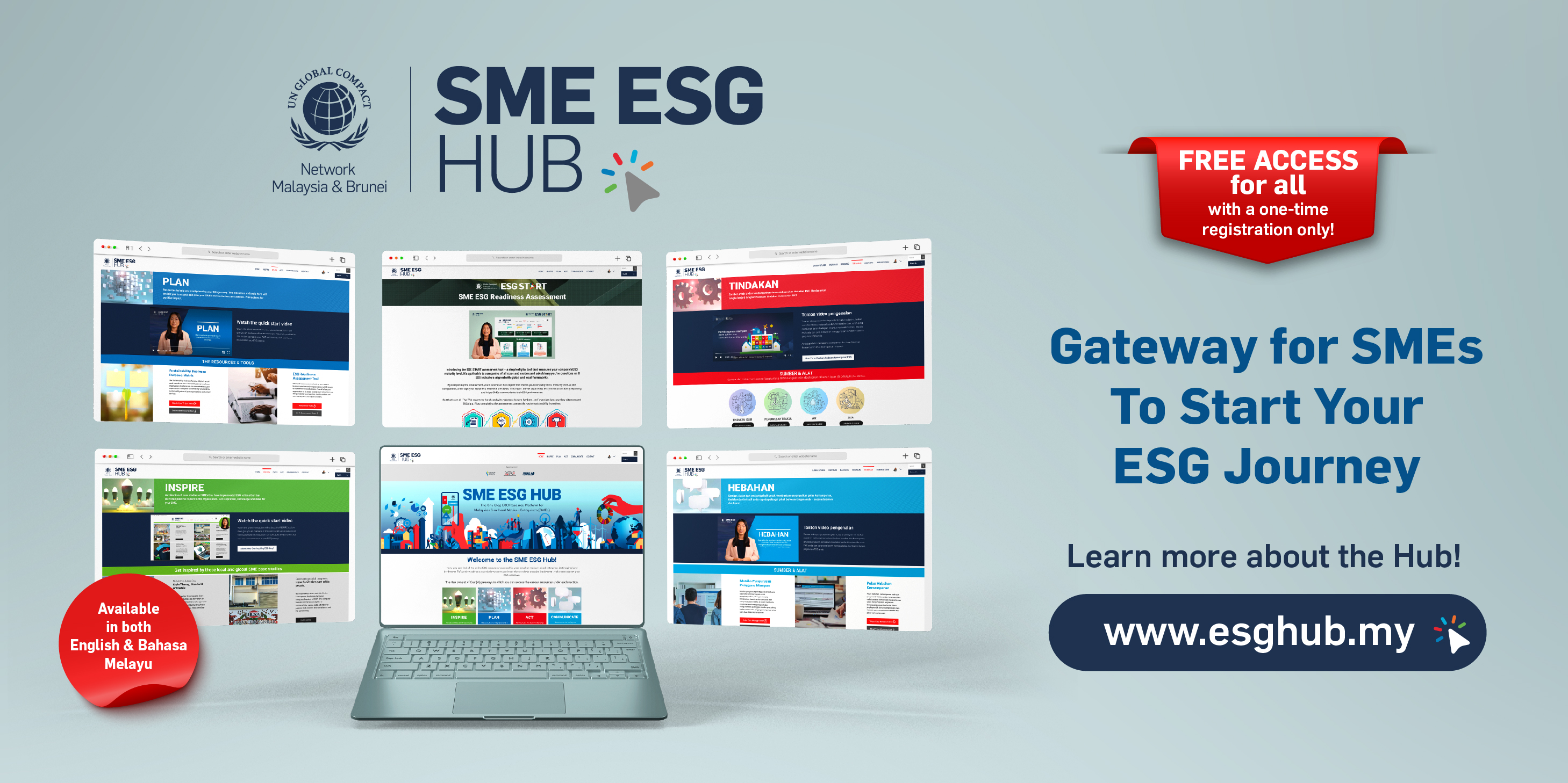 Hence, we are pleased to invite all SMEs to leverage on the SME ESG Hub by UN Global Compact Network Malaysia & Brunei. This hub is a platform where SMEs can find all the online ESG and sustainability resources they need for their business.